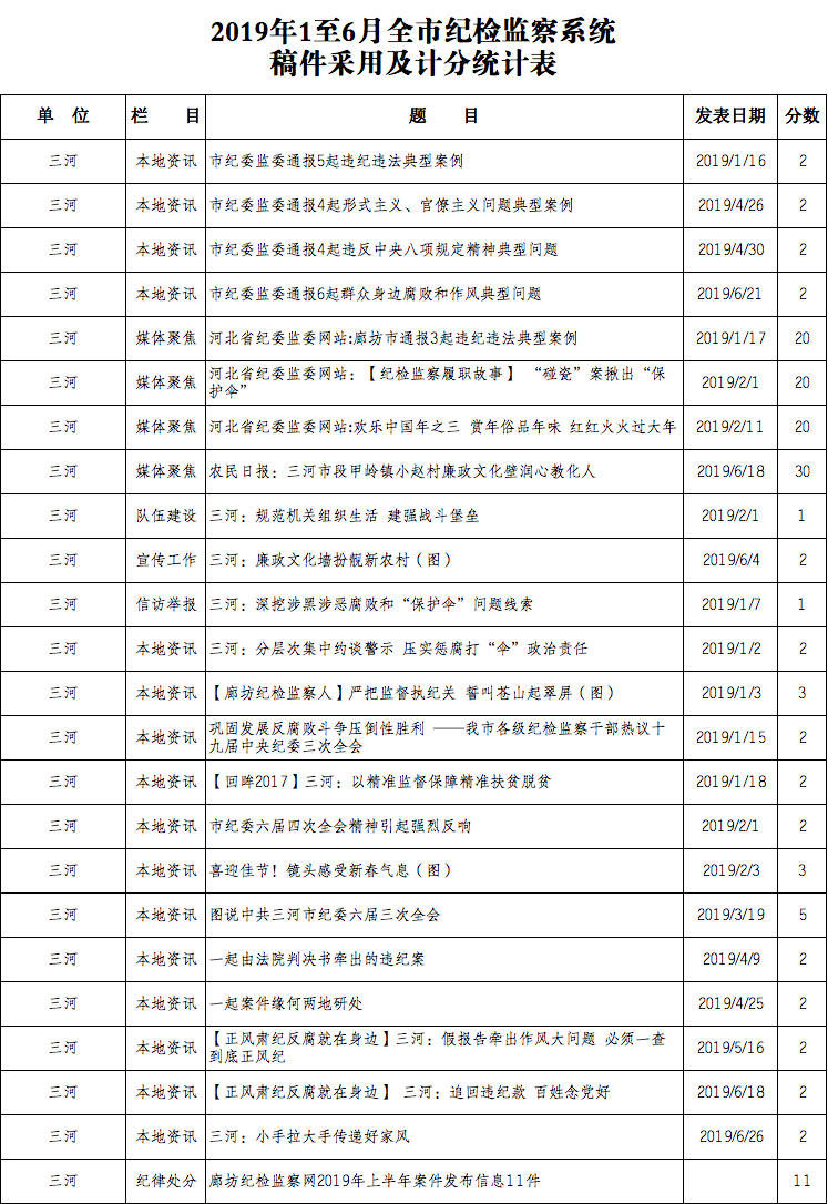 根据《中共廊坊市纪委办公室关于印发<廊坊纪检监察网稿件报送采用考评办法(试行)>的通知》要求,经统计汇总,现将2019年1-12月廊坊纪检监察网稿件采用情况予以公布。